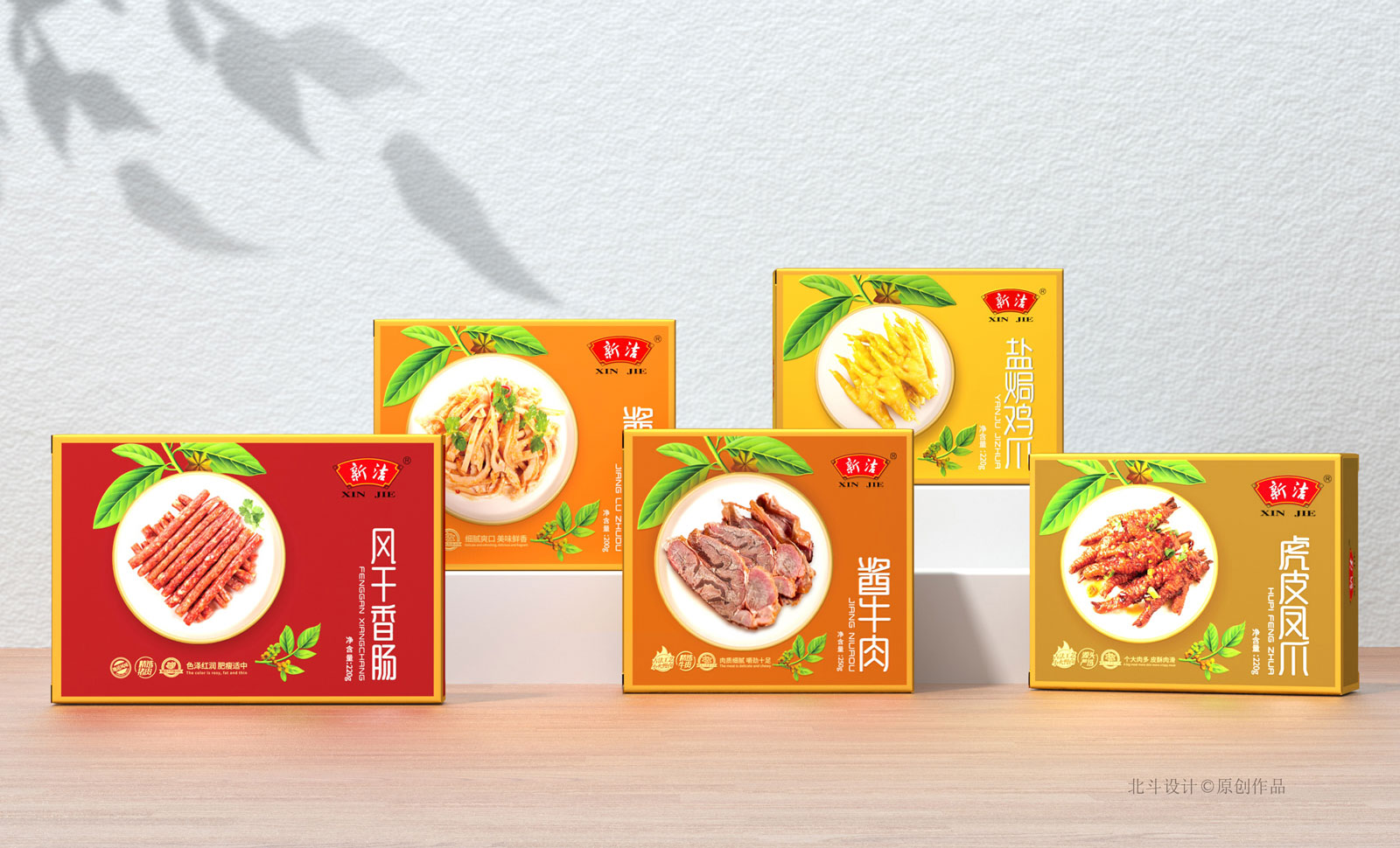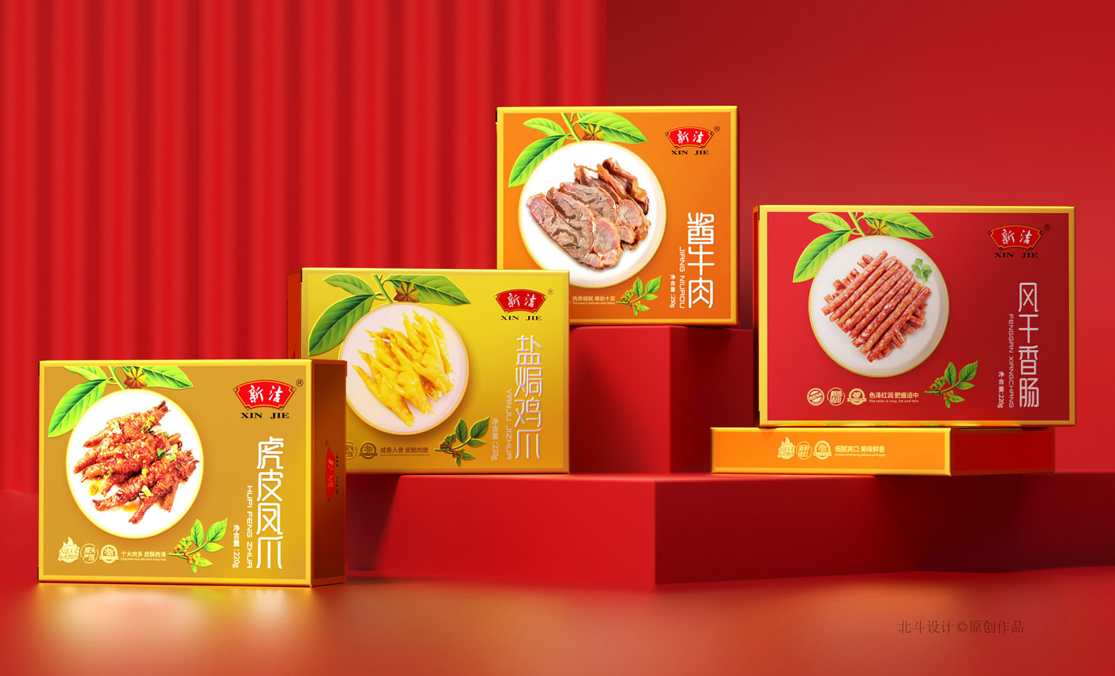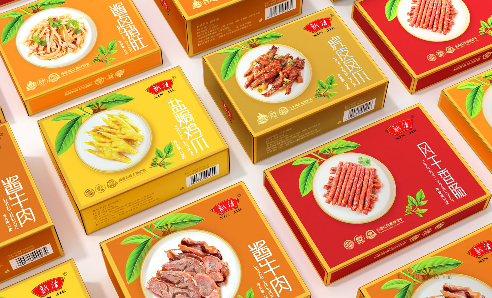 北斗設計于2018年開始與新正食品合作,期間完成了鹵鮮號品牌策劃設計,新潔燒雞系列產品包裝設計,這次合作的項目為升級舊有產品的包裝形象設計,總共五個單品,包含風干香腸,醬牛肉,豬肚,鳳爪。